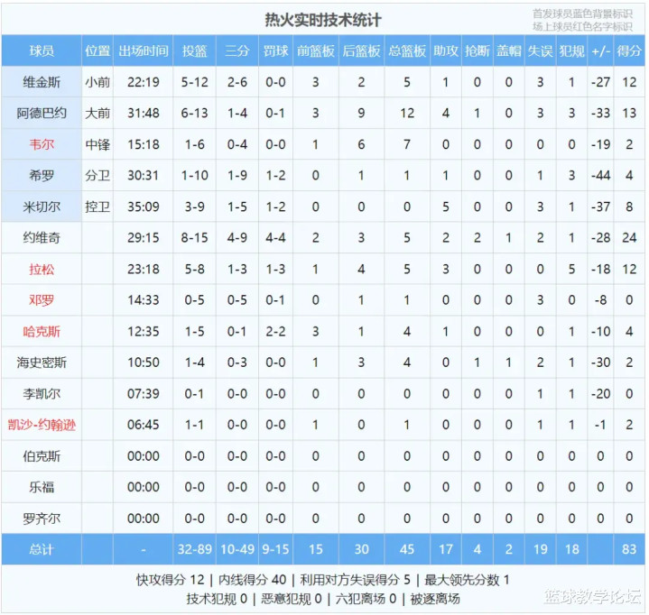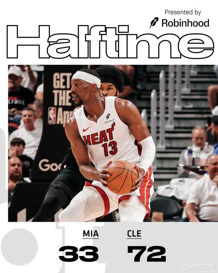 半场39分,是季后赛历史半场第三大的分差!仅次于2017年骑士和凯尔特人的41分,以及1987年活塞和子弹队的40分。维金斯半场5投0中怒砍0分2失误,希罗半场8投仅1中拿到4分,正负值-36全场最低!对热火来说是耻辱一战!